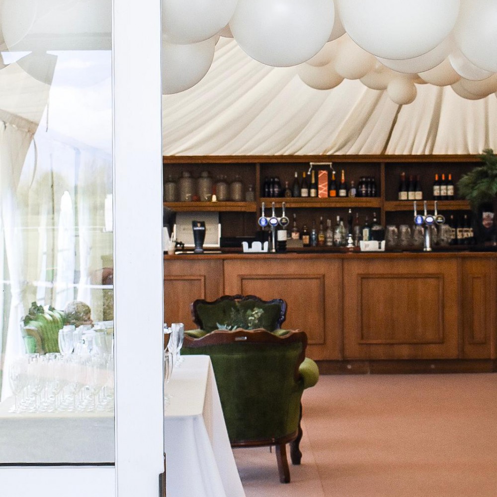 On entering the fully ivory lined marquee you arrive within our large bar area. Our custom built solid oak bar comes fully stocked with all the favourites you might expect, however we are always happy to source specialist drinks or brands upon request. Our bar area comes furnished with two vintage lounge areas.